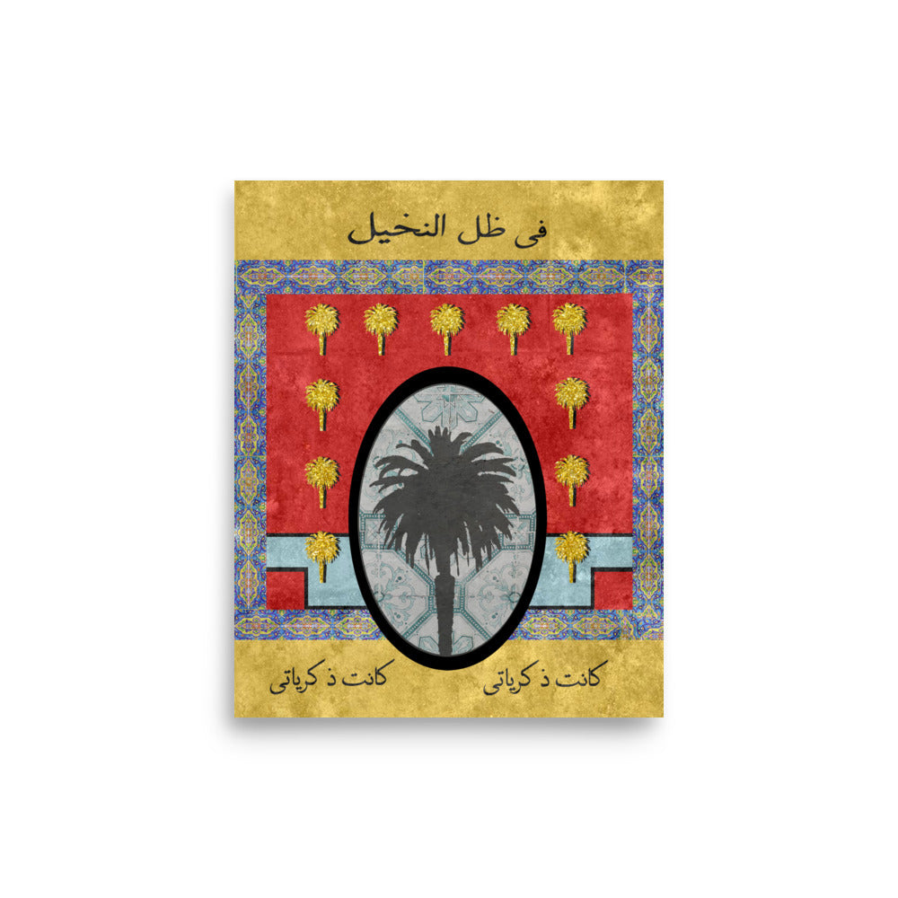 This design is a tribute to Nubia and inspired by Ahmed Mounib's song, "Bilad al Dahab". The lyrics translate to "my memories lay in the shadows of the palm trees."